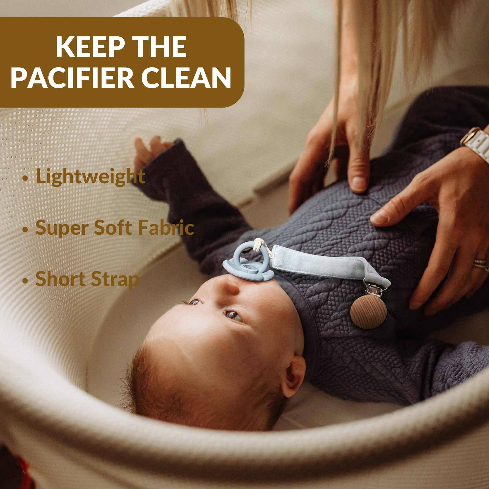 Keep your baby's pacifier close and clean with these super soft fabric pacifier clips. The 2 pack set features lightweight, travel-friendly straps made from gentle fabric that won't irritate your little one's delicate skin. The short straps attach securely to clothing, keeping the wooden pacifier clip within reach. These clips help prevent pacifiers from getting lost or dropped on dirty surfaces, ensuring they stay clean for your baby. The simple design and neutral colours complement any outfit. Prioritise your child's comfort with these essential newborn accessories.